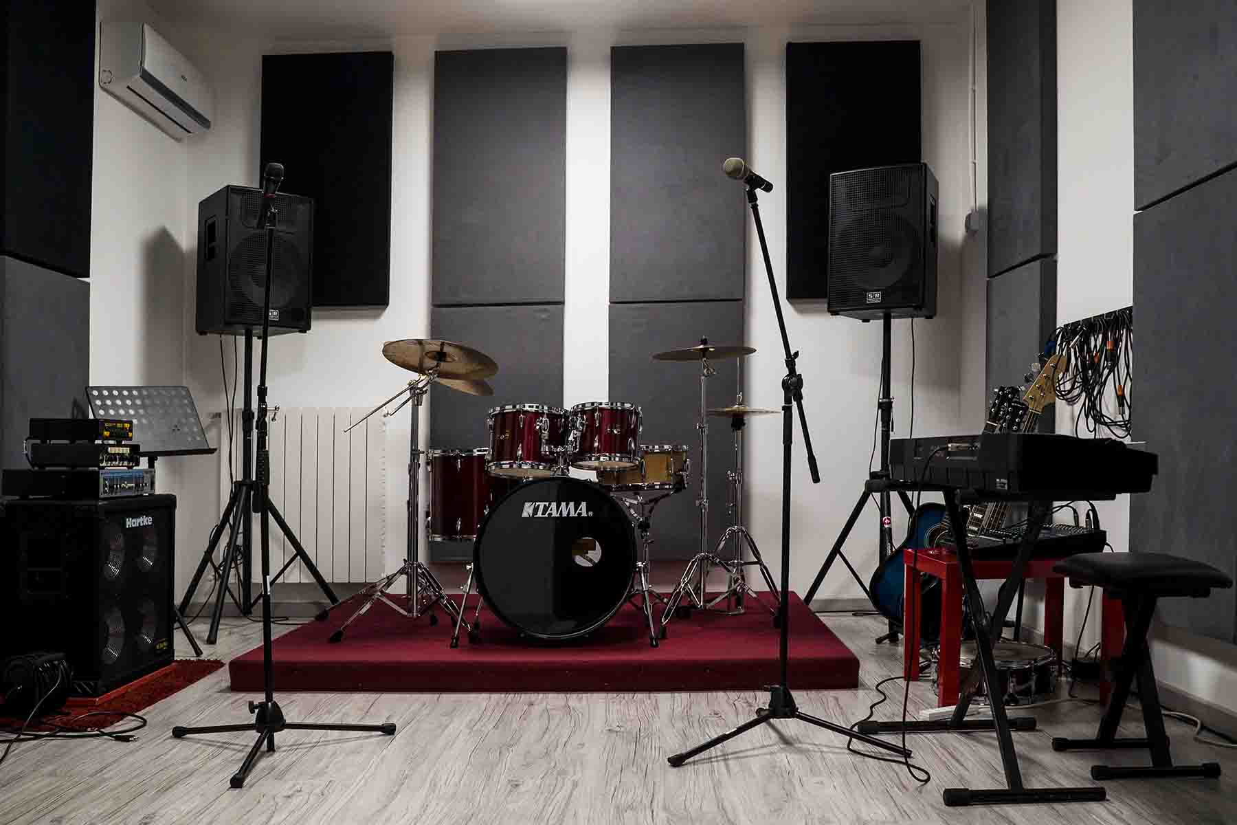 La sala prove si sviluppa su una superficie di circa 20 mq. L’altezza interna è di 2,80 mt ed è dotata di un sistema di ricambio d’aria costante e condizionatore.